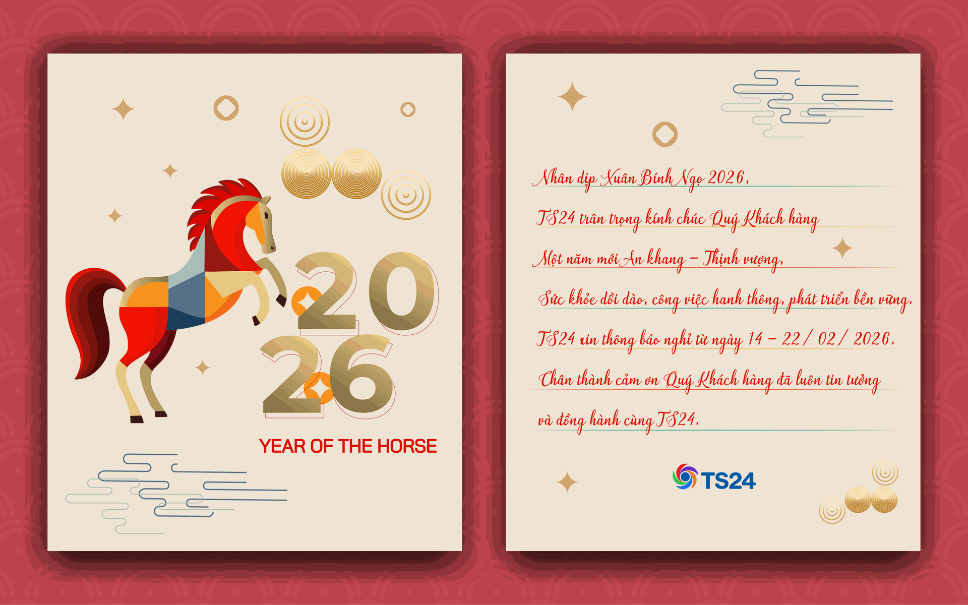 Những ngày cuối năm đang khẽ chạm ngõ, không khí Tết cũng theo đó mà rộn ràng hơn trong từng nhịp sống. Đây là thời điểm để chúng ta tạm gác lại bộn bề công việc, trở về bên gia đình, tận hưởng những khoảnh khắc sum vầy ấm áp và sẵn sàng cho một năm mới nhiều hy vọng. TS24 xin trân trọng thông báo đến Quý khách hàng và Quý doanh nghiệp lịch nghỉ Tết Nguyên đán Bính Ngọ 2026 cụ thể như sau: